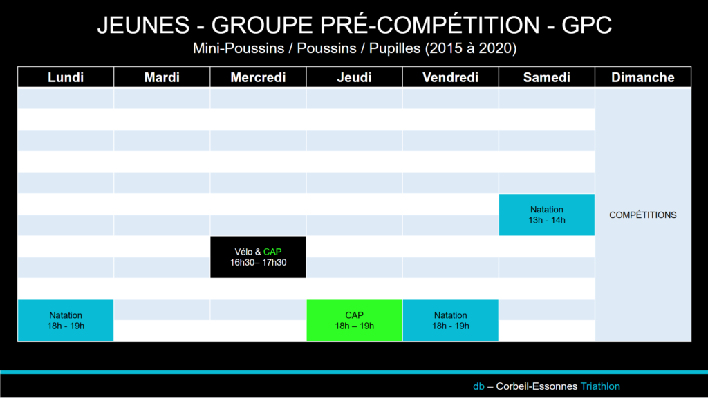 Planning d’entrainements – Saison 2025-2026 Tarifs 2025-2026 & Conditions d’adhésion La section jeunes s’adresse aux jeunes de 6 à 19 ans. Chaque adhérent du DB Corbeil-Essonnes Triathlon s’engage à approuver et respecter le règlement intérieur. 2 Formules sont proposées : Formule 1 – Apprentissage – Adhésion + entrainements + licence FFTri + Challenge IDF : 250€ * + 15€ de caution (carte piscine) Formule 2 – Groupe 1 & 2 – Adhésion + entrainements + licence FFTri + Challenge IDF : 295€ * + 15€ de caution (carte piscine) Réductions 20€ dès qu’au moins 2 membres d’un même foyer sont inscrits au club 20€ à chaque parrainage d’un nouvel adhérent non-inscrit au club en 2023 Conditions d’adhésion : Participer aux entrainements de natation ET de course à pied, et Respecter les consignes des entraineurs Savoir nager & pratiquer les 3 disciplines en compétition (tests de sélection en Septembre) Participer à au moins 3 compétitions du Challenge Triathlon Ile-de-France durant la saison par le club Groupe Apprentissage et Pré-Compétition Le groupe «apprentissage» correspond à une pratique orientée vers le plaisir du sport, la découverte des trois disciplines du triathlon mais sans objectif de performance ni contrainte d’entraînements. Aucun niveau particulier n’est requis pour intégrer le groupe apprentissage, hormis ne pas avoir peur de l’eau. Le groupe “Pré-Compétition” vise à préparer les plus jeunes à une pratique compétitive. Des séances d’une plus grande intensité et plus techniques sont proposées dans les trois disciplines. Groupe Compétition (Groupes 1 & 2) Les groupes « compétition » ont été mis en place pour les jeunes ayant déjà quelques années de pratique du triathlon, souhaitant s’entraîner au moins 4 à 5 fois par semaine et visant des performances ciblées. Pour les athlètes concernés, il est nécessaire de respecter une véritable régularité lors des entrainements, et la participation à plusieurs compétitions (4 à 6 minimum).